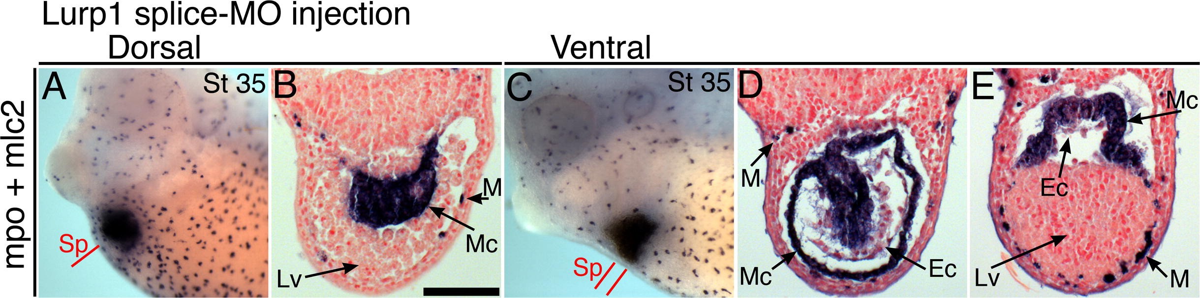 Lurp1 RNA splice-interfering morpholino similarly affects myocardial morphogenesis. (A and B) Stage 35 tadpole injected with Xllurp1-e2i2MO into dorsal blastomeres, 16 ng dose, hybridized to mpo and mlc2. The section plane (B) is indicated on the head (A). (CâE) Control tadpole with same morpholino in ventral blastomeres. Position of two sections (D andindicated (C). Scale bar = 100 μm. Sp, section plane; Mc, myocardium; Ec, endocardium; M, macrophage; Lv, liver.