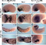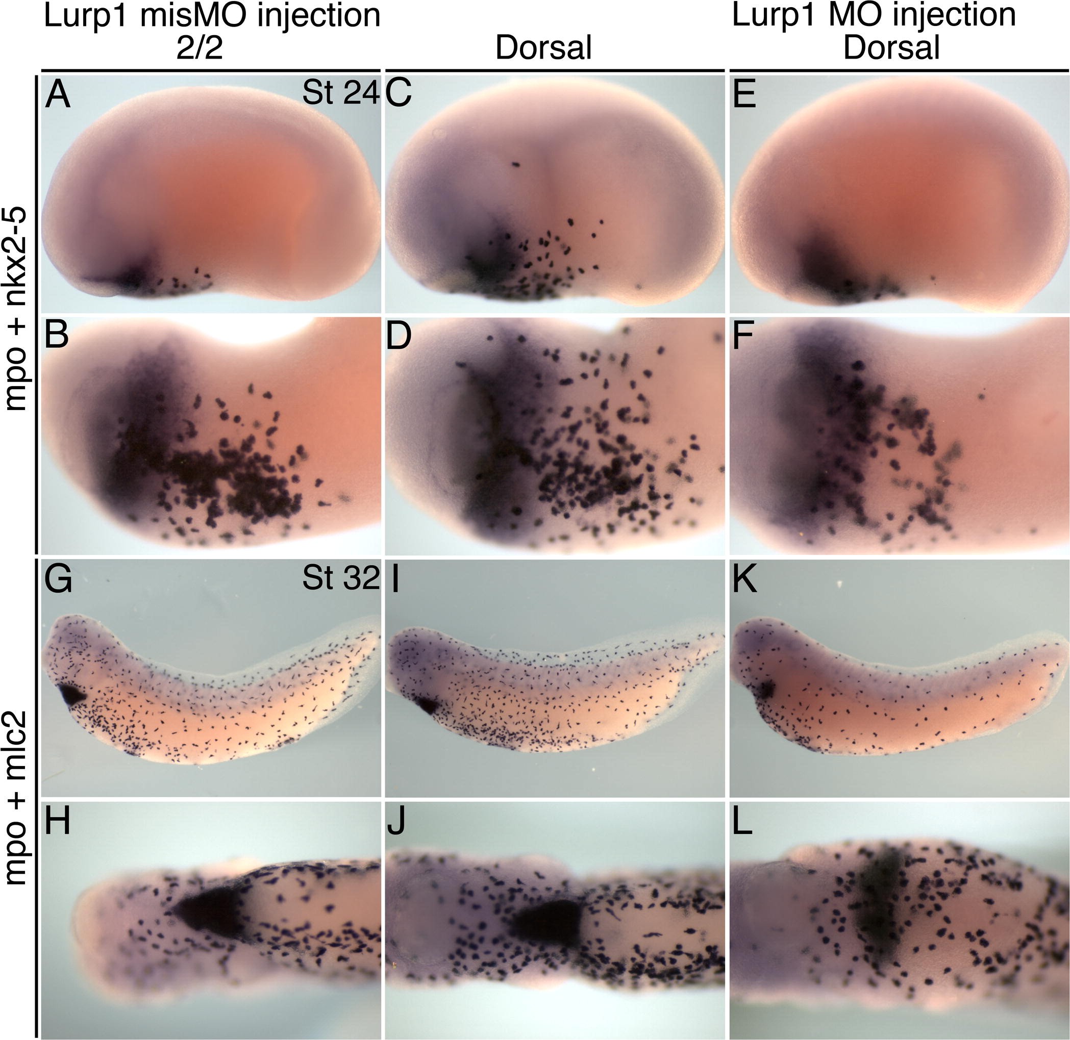 Supl. Fig. 7.Lurp1 mismatch morpholino does not affect Xenopus development. (AâD) Stage 24 embryos injected with the mismatch control morpholino, lurp1-misMO, into both blastomeres at the two-cell stage (A and B), 12 ng dose, or into dorsal blastomeres (C and D). Embryos hybridized to mpo and nkx2-5. (E and F) Sibling embryo injected with the active lurp1 morpholino into dorsal blastomeres at 12 ng dose. (GâJ) Stage 31 tadpoles with the same sequence of mismatch control lurp1 morpholino and hybridized to mpo and mlc2. (K and L) Sibling tadpole injected with the active lurp1 morpholino. Myeloid cell production and embryo development is unaffected by the mismatch control morpholino whereas the active morpholino causes macrophage migration from lateral positions and defective (broader) heart myocardium morphogenesis.