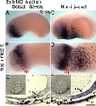 Mesodermal nkx2-5 expression is detected in spib morpholino embryos. (AâD): Stage 25 embryo injected with the Xtspib-e1i1MO into dorsal blastomeres, 40 ng dose (A and B), or non-injected control (C and D). Embryos hybridized to mpo and nkx2-5. (E and F) Transverse sections through the heart field of the embryos. Inset image shows the whole section while main image depicts the region of the ventral midline. Arrowheads indicate dark mpo stain (E and F). NFR-counterstained. Scale bar = 100 μm. Sp, section plane; Me, mesoderm; En, endoderm.
