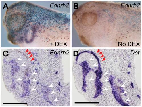 DEX treatment was performed at stage 22. White arrowheads illustrate the ectopic expression of Ednrb2 (A) and Dct (B). Scale bar ¼ 100 mm.