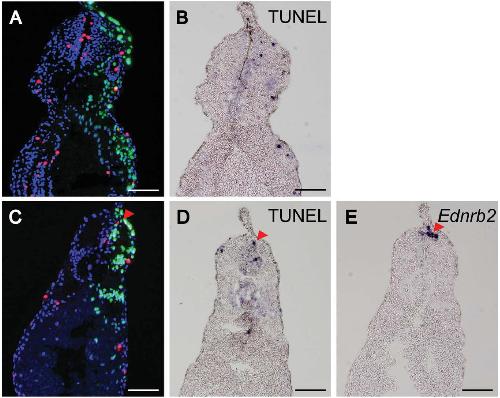 (E). Red arrows indicate a TUNEL-positive melanoblast in Ednrb2 over-expressed cells (CâE). Scale bar ¼ 100 mm.
