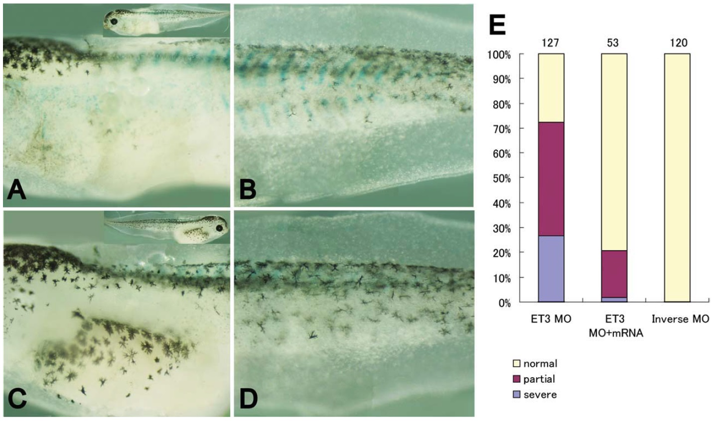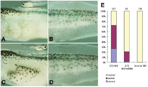 whole image of the embryo, respectively. C,D: The non-injected side view of the ET3 MOinjected embryo. The yolk (C) and the tail (D) regions are shown. These images are mirror-reversed for easy comparison. E: Percentage of each phenotype in the injected embryos. The