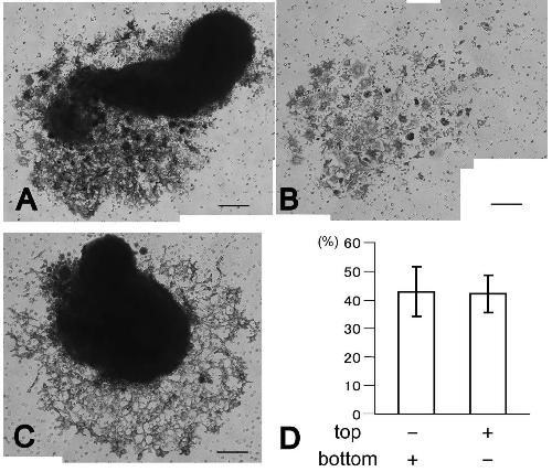 2.5 nM (A, B) ET3 was added to the bottom well. A and C show melanophores on both side. These cells are observable because of transparency of the membrane. B represents only melanoblasts that had invaded to the bottom side of the filter in A. This was observed only when 2.5 nM ET3 had been added (B). D: Ratio between the numbers of invaded melanophores/total melanophores in samples that showed invaded melanophores. NTs were cultured with (+) or without (-) ET3 (2.5 nM). Top, top well; bottom, bottom well. Note that this graph does not include samples that did not show melanophore invasion. Error bars represent standard errors. Scale bar ¼ 100 mm.