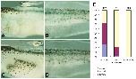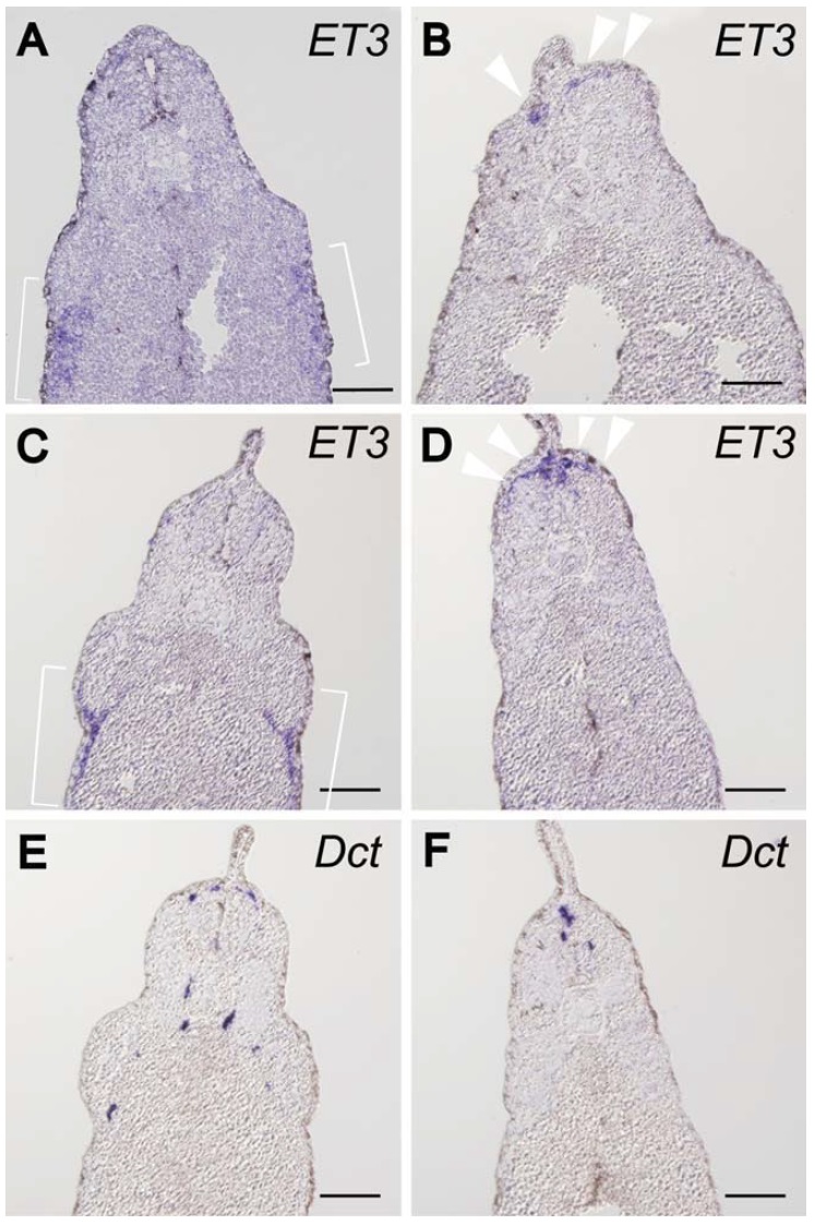 Fig. 4. Expression patterns of ET3. A,C: ET3 is expressed in the rostral trunk region, where melanophores later migrate to the yolk at stages 25 (A) and 31 (B). B,D: ET3 is expressed in thecaudal trunk region where melanophores later localize in the NT. E,F: Dct expression represents