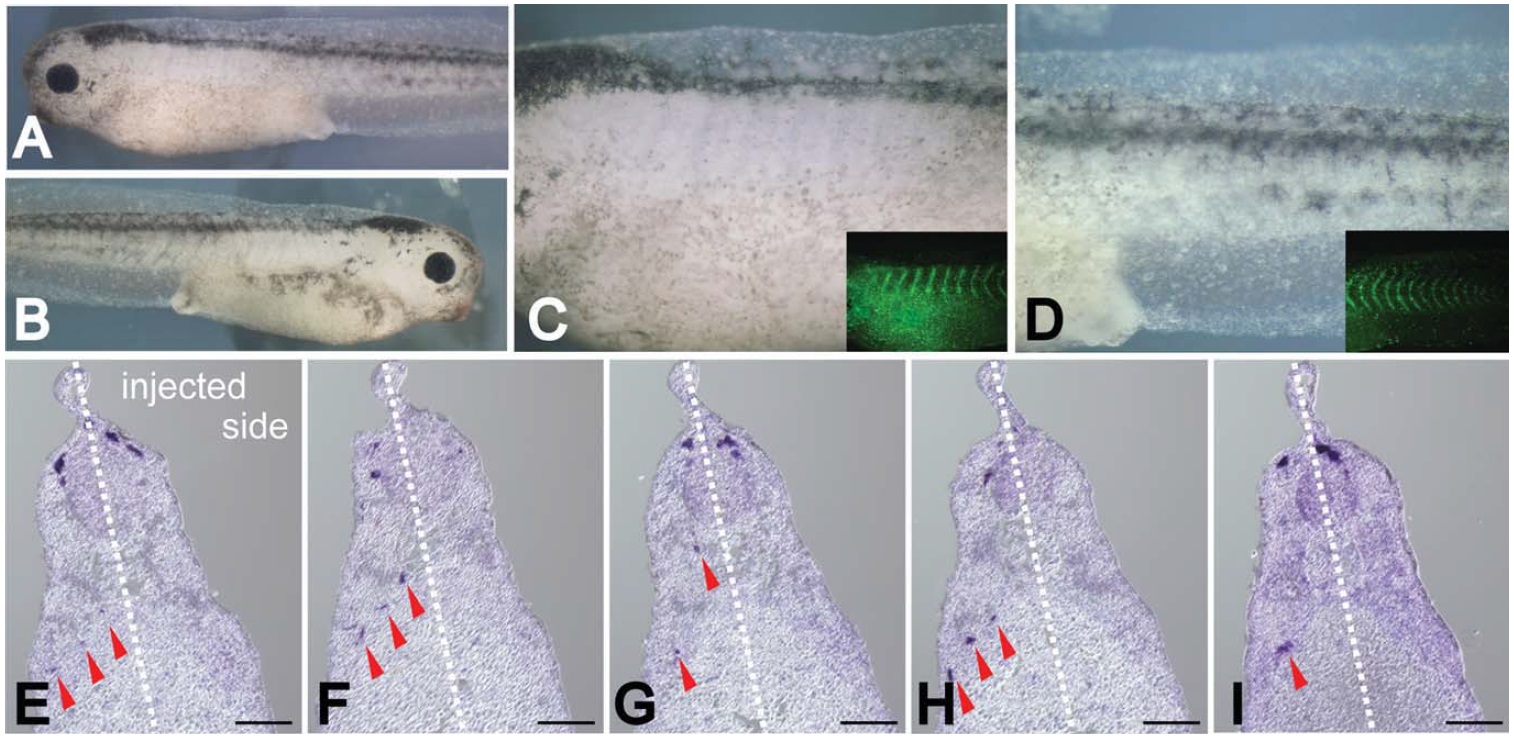 (C), while no difference is observed in the tail region (D). Each inset shows Venus fluorescence as a tracer. EâI: A series of sections (8 mm each at 40-mm intervals, anterior to posterior) of an Ednrb2 over-expressed embryo stained with Dct ISH. The injected side is on the right side of each image. Red arrowheads illustrate melanoblasts migrating through the ventral pathway in the non-injected side. No melanoblasts are observed in the ventral pathway on the Ednrb2 -
