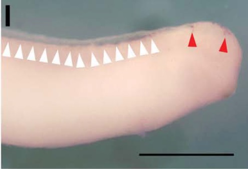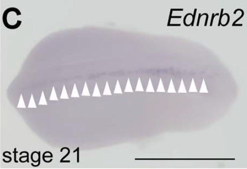 ednrb2 (endothelin receptor B subtype 2) gene expression in Xenopus laevis embryo, assayed via in situ hybridization, NF stage 21, dorsal view, anterior right, dorsal up.