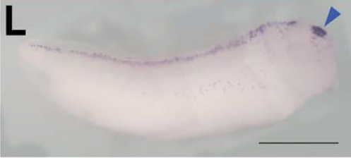 ednrb2 (endothelin receptor B subtype 2) gene expression in Xenopus laevis embryo, assayed via in situ hybridization, NF stage 28, lateral view, anterior right, dorsal up.