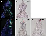 Fig. 6. Cell proliferation and apoptosis in a representative Ednrb2 over-expressed embryo at stage 30. AâE: Serial sections around the otic vesicle (A, B) and in the trunk region (CâE). Red, green, and blue signals represent cell proliferation (M-phase) detecting phospho-Histone H3,