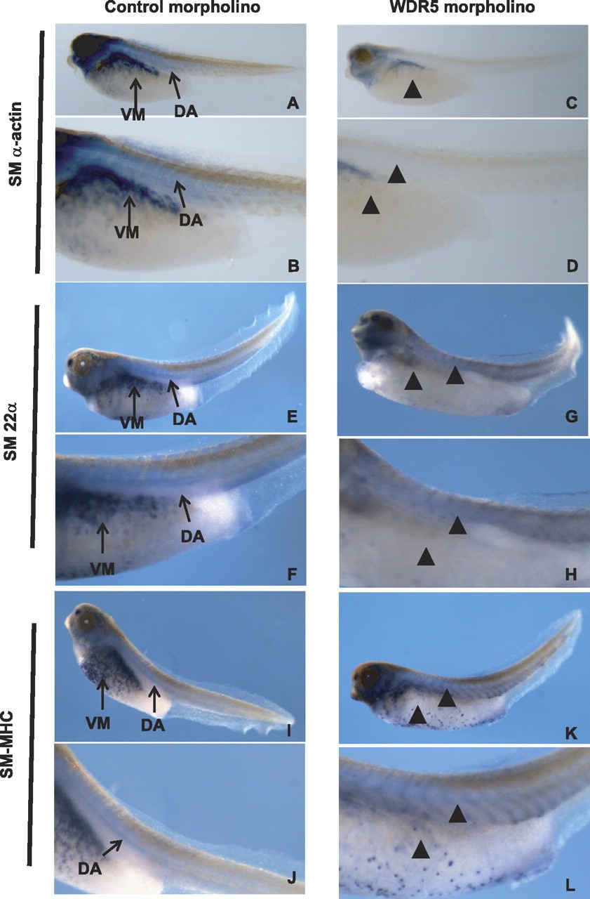 WD repeat-containing protein 5 (WDR5) is a common component of mammalian mixed lineage leukemia methyltransferase family members and is important for histone H3 lysine 4 methylation (H3K4me), which has been implicated in control of activation of cell lineage genes during embryogenesis. However, WDR5 has not been considered to play a specific regulatory role in epigenetic programming of cell lineage because it is ubiquitously expressed. Previous work from our laboratory showed the appearance of histone H3K4me within smooth muscle cell (SMC)-marker gene promoters during the early stages of development of SMC from multipotential embryonic cells but did not elucidate the underlying mechanisms that mediate SMC-specific and locus-selective H3K4me. Results presented herein show that knockdown of WDR5 significantly decreased SMC-marker gene expression in cultured SMC differentiation systems and in Xenopus laevis embryos in vivo. In addition, we showed that WDR5 complexes within SMC progenitor cells contained H3K4 methyltransferase enzymatic activity and that knockdown of WDR5 selectively decreased H3K4me1 and H3K4me3 enrichment within SMC-marker gene promoter loci. Moreover, we present evidence that it is recruited to these gene promoter loci through interaction with a SMC-selective pituitary homeobox 2 (Pitx2). Taken together, studies provide evidence for a novel mechanism for epigenetic control of SMC-marker gene expression during development through interaction of WDR5, homeodomain proteins, and chromatin remodeling enzymes.