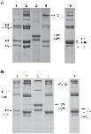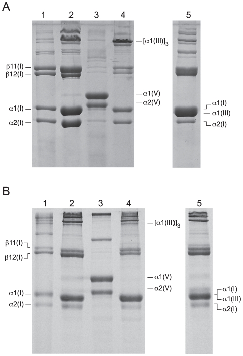 Figure 1. Isolated collagen species from chicken and xenopus on 6% SDS-PAGE.A, chicken collagens; lane 1, acid soluble fraction; lane 2, neutral 1.0 M salt soluble fraction ; lane 3, acid 1.2 M salt fraction; lane 4, neutral salt insoluble fraction; lane 5, reduced neutral salt insoluble fraction. B, xenopus collagens; lane 1, acid soluble fraction; lane 2, neutral 1.0 M salt soluble fraction; lane 3, acid 1.2 M salt fraction; lane 4, neutral salt insoluble fraction; lane 5, reduced neutral salt insoluble fraction. β11(I) and β12(I) are cross-linked α1-α1 and α1-α2 chain dimers, respectively.