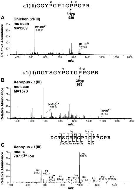 Figure 2. Mass spectra of tryptic peptides containing the A1 site from chicken and xenopus α1(III).Comparison of full scan spectra from LC-MS profiles of in-gel trypsin digests of the homologous sequence in the α1(III) chain from A, chicken; and B, xenopus. C, MS/MS analysis of the 3Hyp containing tryptic peptide from xenopus.