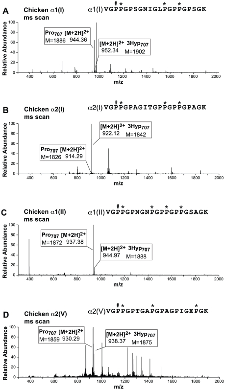 Figure 3. Mass spectra of tryptic peptides containing the A3 site in chicken fibrillar collagens.Full scan spectra from LC-MS profiles of in-gel trypsin digests of α1(I) from chicken bone, A; α2(I) from chicken skin, B; α1(II) from chicken cartilage, C; and α2(V) from chicken skin, D. The degree of hydroxylation at P707 is estimated through a correlation with the relative abundance of the representative ions. P*, 4Hyp; P#, 3Hyp.