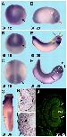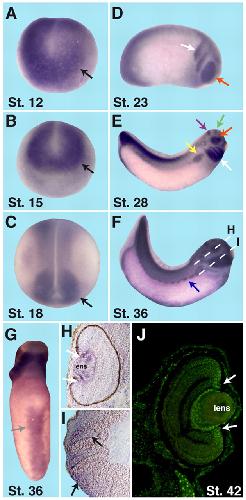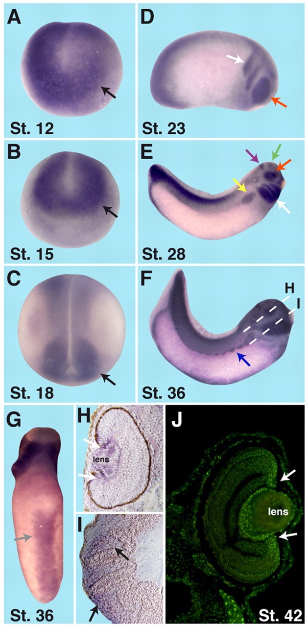 Fig. 1. The spatial expression pattern of X. laevis PPan. (A-C) PPan is expressed in the neural plate (arrows), as monitored from stage 12 to 18. (D) At stage 23, PPan transcripts accumulate in the eye (red arrow), the cranial neural crest cells (NCCs; white arrow), and in the posterior part of the embryo (left). (E) Arrows point to the different PPan expression domains at stage 28: eye (red), forebrain (green), midbrain (violet), branchial arches (white) and pronephros (yellow). (F,G) PPan is expressed in the hypaxial muscles (F, arrow) and the blood islands (G, arrow) at stage 36. (H) Transverse section (plane indicated in F) of the eye at stage 36 shows PPan expression in the ciliary marginal zone (CMZ; arrows) and in the lens. (I) Transverse section (plane indicated in F) at stage 36 indicates PPan expression in the branchial arches (arrows). (J) Transverse section of the eye shows PPan protein localized in the CMZ (arrows) and in the lens.