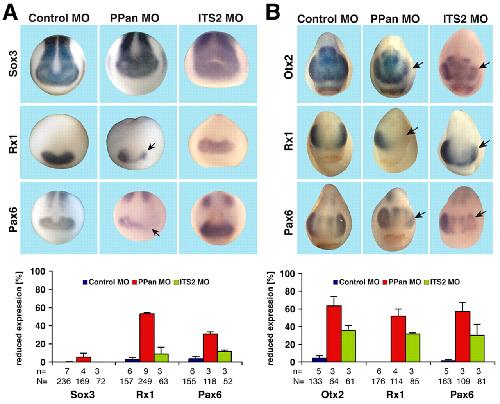 Fig. 4. PPan functions in early eye field induction. (A) Expression of Sox3, Rx1 and Pax6 was analyzed at stage 13. PPan-depleted Xenopus embryos exhibit reduced expression of Rx1 and Pax6 in the eye field (arrows). (B) At stage 23, expression of Otx2, Rx1 and Pax6 was strongly reduced upon PPan MO injection and slightly reduced upon ITS2 MO injection on the affected side (arrows). Quantitative evaluations are given beneath. n, number of independent experiments; N, total number of embryos examined. Error bars indicate s.e.m.