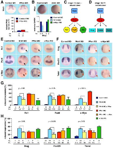 Fig. 7. PPan acts downstream of Wnt4. (A) PPan MO injection has no effect on Wnt4 expression at stage 13. (B) Representative Xenopus embryos displaying reduced expression of PPan at stage 13 upon bilateral injection of 20 ng Wnt4 MO (animal-dorsal, 8-cell stage). For qRT-PCR analyses, embryos were injected with noggin RNA (200 pg) and Wnt4 MO (3 ng) or c-Myc MO (10 ng) bilaterally at the 2-cell stage. Noggin-induced neuralized ACs were dissected and cultured to the equivalent of stage 13. Data are presented as relative units normalized to Control MO-injected samples. (C) Hypothesis I. PPan acts downstream of Wnt4 and upstream of Rx1, Pax6 and c-Myc at stage 13 in the context of eye and NC development. (D) Hypothesis II. PPan acts between Wnt4 and NC-specific genes during NC induction. (E) Unilateral PPan MO as well as Wnt4 MO injection interfere with Rx1, Pax6 and c-Myc expression on the injected side (black arrow, eye; red arrow, NC) at stage 13. By contrast, c-Myc MO has only a slight effect on Rx1 and Pax6 expression. (F) Wnt4, PPan and c-Myc depletion lead to a similar downregulation of the NC marker genes Slug, FoxD3 and Twist at stage 16/17. (G,H) Quantification of the experiments in E (G) and F (H). Co-injection of PPan RNA rescues Wnt4 MO-induced reduction of all analyzed eye and NC marker genes. By contrast, co-injection of c-Myc RNA does not revert PPan MO-induced effects. n, number of independent experiments; N, total number of embryos examined. Error bars indicate s.e.m.