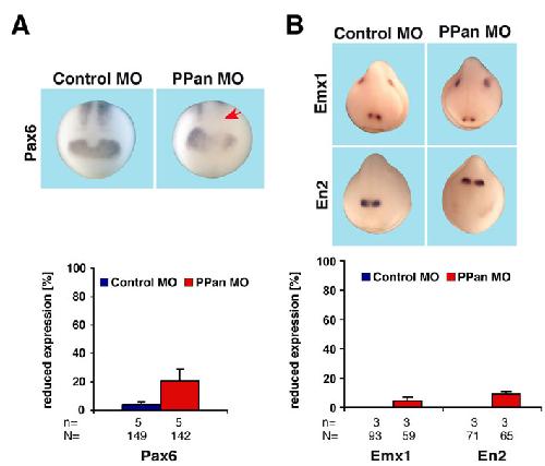 Fig. S6. PPan depletion affects Pax6 but not Emx1 or En2 expression in the brain. PPan or Control MO (5 ng) were injected into one animal-dorsal blastomere at the 8-cell stage. (A) PPan depletion has a slight effect on Pax6 expression in the posterior neural plate at stage 13 (arrow). (B) PPan knockdown interferes with the expression of neither the forebrain marker Emx1 nor the midbrain-hindbrain boundary marker Engrailed2 (En2). n, number of independent experiments; N, total number of embryos examined. Error bars indicate s.e.m.
