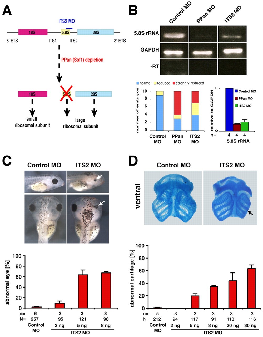 Fig. 3. Interference with ribosome biogenesis phenocopies PPan knockdown. (A) Xenopus 28S, 18S and 5.8S rRNAs are transcribed as a common rRNA precursor separated by the internal transcribed spacers 1 and 2 (ITS1 and ITS2). The binding site of ITS2 MO is indicated. ETS, external transcribed spacer. (B) Both PPan MO and ITS2 MO injection resulted in reduced 5.8S rRNA levels in anterior neural tissue at stage 23. Ten individual explants per MO were analyzed by RT-PCR. The agarose gel shows representative examples for reduced (ITS2 MO) and strongly reduced (PPan MO) signals. qRT-PCR analyses are also given (right). The data are presented as relative units normalized to Control MO-injected samples. (C,D) ITS2 MO injection into one animal-dorsal blastomere at the 8-cell stage results in severe eye (C) and craniofacial cartilage (D) defects in a dose-dependent manner (arrows). Quantitative evaluations are given beneath. n, number of independent experiments; N, total number of embryos examined. Error bars indicate s.e.m.