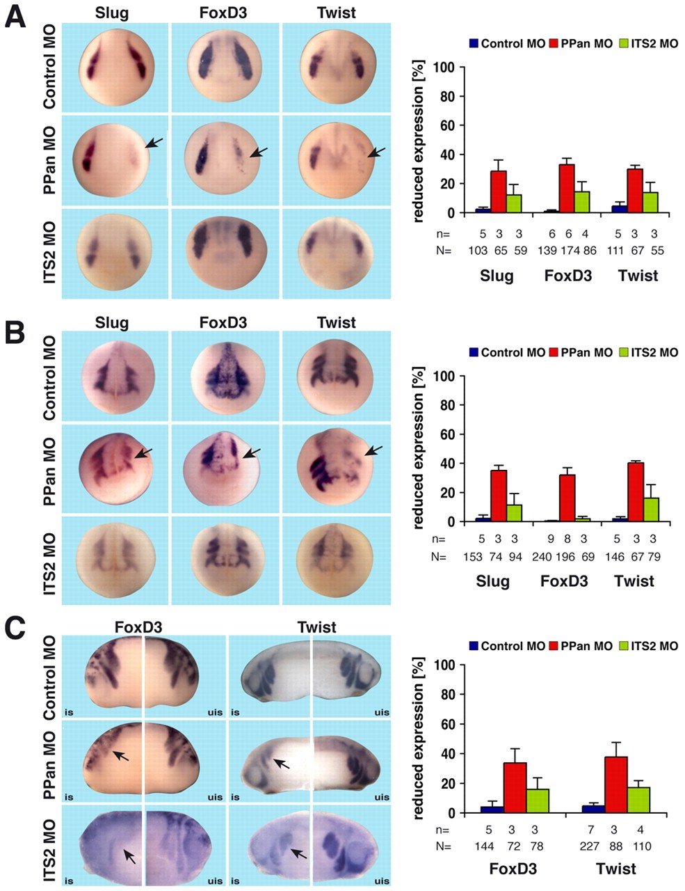 Fig. 5. PPan depletion results in defects in NC induction. (A-C) To study the behavior of NCCs upon PPan MO or ITS2 MO injection, Slug, FoxD3 and Twist expression was analyzed. Slug, FoxD3 and Twist expression at stages 16/17 (A) and 20 (B) as well as FoxD3 and Twist expression at stage 23 (C) was reduced on the injected side upon PPan depletion, whereas ITS2 MO injection had little or no effect on NC specification and migration (arrows). Quantitative evaluations are given to the right. n, number of independent experiments; N, total number of embryos examined. Error bars indicate s.e.m.