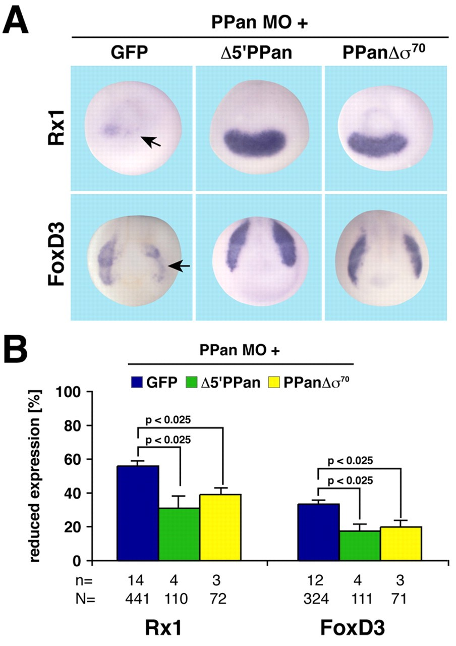 Fig. 6. δ5â²UTR PPan and PPanδÏ70 rescue defects in marker gene expression caused by PPan MO. (A) Co-injection of either 2 ng δ5â²UTR PPan or 2 ng PPanδÏ70 rescued the effect of 5 ng PPan MO on Rx1 expression at stage 13 and FoxD3 expression at stage 16 (arrows). (B) Quantification of the experiment in A. n, number of independent experiments; N, total number of embryos examined. Error bars indicate s.e.m.