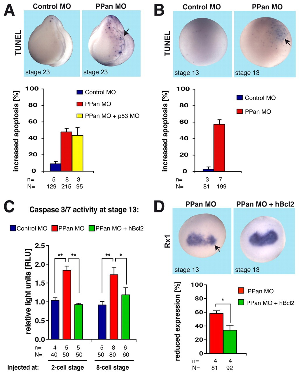 Fig. 8. PPan has a function in apoptosis. (A) Eight-cell stage Xenopus embryos were injected with PPan MO (5 ng) or Control MO (5 ng) into one animal-dorsal blastomere. TUNEL staining was used to label apoptotic cells. PPan depletion results in increased apoptosis on the manipulated side at stage 23 (arrow), which could not be rescued by co-injection of p53 MO (5 ng). Control MO-injected embryos were not affected. A quantitative evaluation is given beneath. (B) The increase in apoptosis can already be observed at stage 13. (C) Bilateral injection of 40 ng PPan MO at the 2-cell stage leads to increased activity of caspases 3 and 7. This effect can be reverted by co-injection of 4 ng human (h) BCL2 RNA. The same effect was observed upon injection (bilateral, animal-dorsal) of 10 ng PPan MO and 2 ng human BCL2 RNA at the 8-cell stage. Values represent relative light units (RLU) normalized to one Control MO-injected sample per series of experiments. (D) Co-injection of 1 ng human BCL2 RNA into one animal-dorsal blastomere at the 8-cell stage rescued the PPan MO-induced reduction of Rx1 expression (arrow). **, P<0.01; *, P<0.05. n, number of independent experiments; N, total number of embryos examined. Error bars indicate s.e.m.