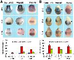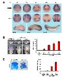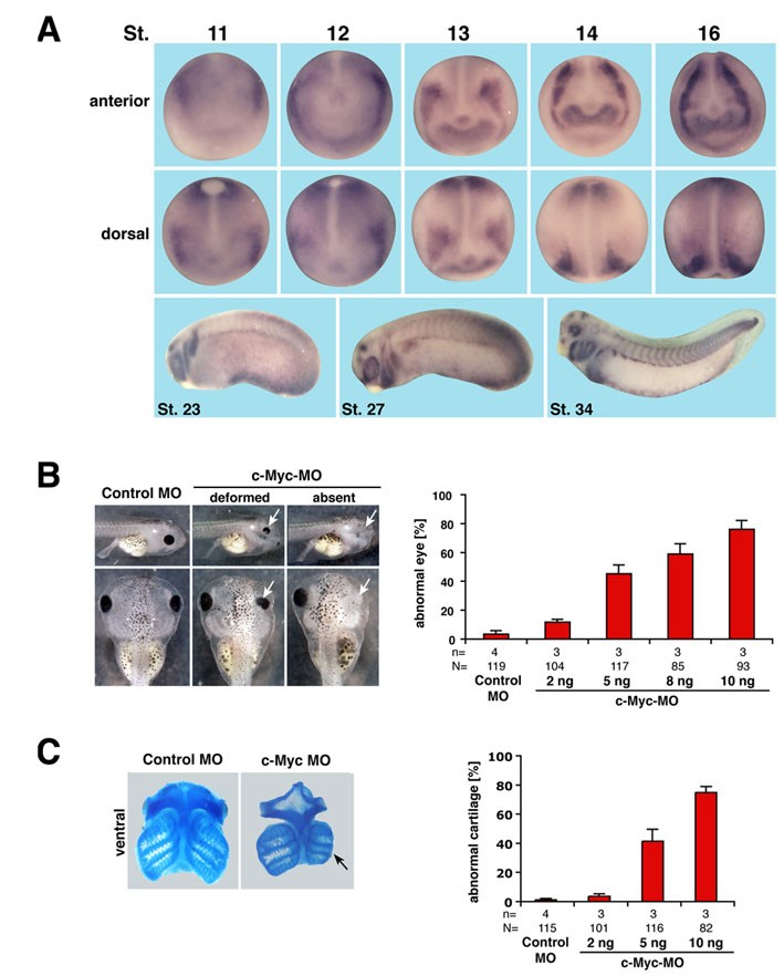 Fig. S7. c-Myc knockdown phenocopies PPan depletion. (A) c-Myc expression monitored from stage 11 to 16 and later stages. c-Myc transcripts are located in the prospective neural crest region first detectable at stage 11 and, in addition, in the eye field first visible at stage 13. At later stages, c-Myc has expression domains similar to those of PPan, e.g. in the branchial arches, the eye, the pronephros the forebrain and midbrain, the hypaxial muscles and the blood islands. (B,C) c-Myc MO (Bellmeyer et al., 2003) was injected into one animal-dorsal blastomere at the 8-cell stage. c-Myc depletion results in severe eye (B) and craniofacial cartilage (C) defects (arrows) in a dose-dependent manner. n, number of independent experiments; N, total number of embryos examined. Error bars indicate s.e.m.