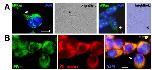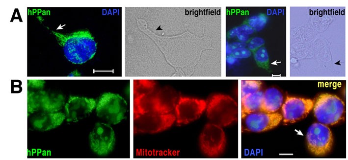 Fig. S10. PPan is located in the mitochondria. (A) Comparison of PPan immunostainings and brightfield images clarify the localization of PPAN in extranuclear compartments of HEK293 cells (arrows). (B) Counterstaining of the mitochondria using MitoTracker Red CMXRos revealed that PPAN is located in the mitochondria. The arrow points to the cell shown in Fig. 9. Scale bars: 10 .