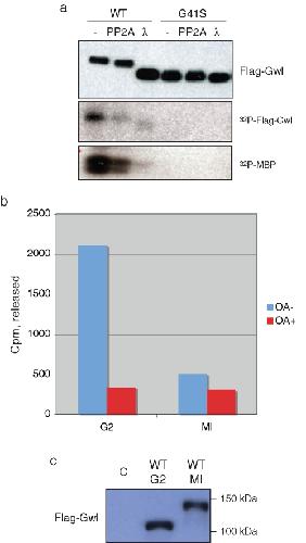 FIGURE 2:. Greatwall-bound PP2A is catalytically active. (A) Dephosphorylation and deactivation of Gwl. Oocytes were injected with mRNA encoding WT or G41S Gwl. After overnight incubation to allow protein expression, the oocytes were treated with progesterone. At GVBD, oocyte lysates were prepared and anti-FLAG bead immunoprecipitates incubated with either PP2Ac or lambda phosphatase as described in Materials and Methods. The precipitates were then washed and assayed for autophosphorylation or MBP kinase activity (bottom, autoradiographs), or blotted with anti-FLAG antibodies after SDS–PAGE (top), as indicated. (B) Phosphatase activity associated with Gwl. Oocytes were injected with mRNA encoding WT FLAG-tagged Gwl and incubated overnight. Some oocytes were then treated with progesterone to enter M phase. At GVBD, anti-FLAG beads were used to precipitate Gwl, and after washing, the beads were incubated with or without OA and 32P-labeled histone H1 prepared as described in Materials and Methods. The reaction was terminated by addition of 30% trichloracetic acid, and the counts per minute released were quantified by Cerenkov counting in a liquid scintillation counter. Similar results were obtained in several independent experiments. (C) Anti-FLAG immunoblot of the immunoprecipitates in B. C, control oocytes not injected with mRNA but subjected to anti-FLAG bead precipitation and assay. Activity associated with Gwl in B was corrected for background seen with control FLAG bead immunoprecipitates from uninjected oocytes.