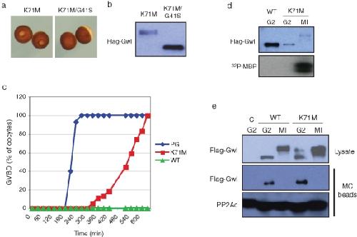 FIGURE 3:. K71M Greatwall induces oocyte maturation in the absence of progesterone. (A) Oocyte morphology. Maturation (GVBD) was assessed by white-spot formation in oocytes incubated overnight after injection of mRNA encoding K71M Gwl or K71M/G41S Gwl, as indicated. (B) Electrophoretic mobility. Lysates from the oocytes in A were Western blotted for FLAG. (C) Germinal vesicle breakdown. Oocytes were treated with progesterone (blue) or microinjected with equal amounts of mRNA encoding either WT Gwl (green) or K71M Gwl (red). Maturation was monitored at the indicated times by the appearance of a white spot signifying GVBD. (D) K71M Gwl kinase activity. Top, the oocytes in (C) expressing WT or K71M Gwl at 240 min (G2) after injection or expressing K71M Gwl at 420 min after injection with a white spot (GVBD, MI) were analyzed by Western blot for Gwl expression. Bottom, the same oocytes were lysed, and Gwl was immunoprecipitated on anti-FLAG beads and analyzed for kinase activity against MBP as described in Materials and Methods. An autoradiograph is shown. (E) K71M Gwl releases PP2A in M phase. Oocytes were injected with mRNA encoding either FLAG-WT or FLAG-K71M Gwl and treated with the proteosome inhibitor MG132. Some FLAG-WT Gwl mRNA-injected oocytes were treated with progesterone to undergo GVBD (MI). G2 and MI lysates were prepared and analyzed by MC bead precipitation and Western blotting as described in