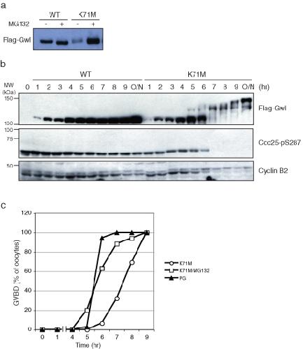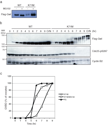FIGURE 6:. K71M Gwl is an unstable protein. (A) Greatwall accumulation. mRNA encoding either WT FLAG-Gwl or FLAG-K71M Gwl was injected into oocytes, and after 4 h of incubation in the absence or presence of the protesome inhibitor MG132 the level of expressed Gwl was assessed by SDS–PAGE and immunoblotting for FLAG-Gwl. (B) Maturation with K71M Gwl and MG132. Oocytes were injected with mRNA encoding FLAG-WT or K71M Gwl and incubated with medium containing 50 μM MG132. At the indicated times, oocyte lysates were prepared and Western blotted for FLAG-Gwl, active Cdc25C (pSer287), and cyclin B2. GVBD (unpublished data) began at 6 h after injection. (C) Acceleration of K71M-induced GVBD by MG132. Oocytes were injected with mRNA encoding K71M Gwl and incubated in the presence or absence of MG132 or treated with progesterone. The time course of GVBD was assessed by white-spot formation at the indicated times.