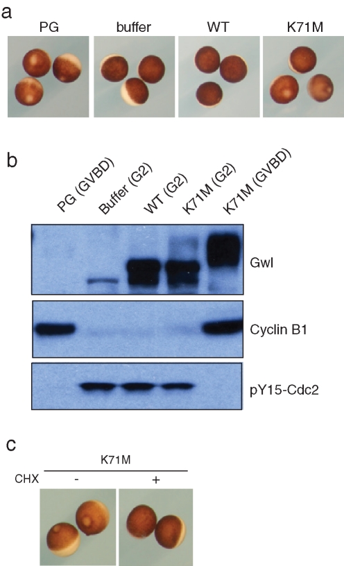 FIGURE 4:. K71M Gwl protein induces oocyte maturation. (A) Oocyte morphology. Oocytes were treated with progesterone or injected with buffer or WT or K71M Gwl proteins purified from non-OA treated (interphase) Sf9 cells. After incubation overnight, GVBD was assessed by white-spot formation. An oocyte that did not undergo GVBD with K71M Gwl was designated “G2” (e.g., upper oocyte, right panel). (B) Analysis of K71M Gwl expressing oocytes. The oocytes in A were lysed and Western blotted for Gwl, cyclin B1, and pY15 Cdc2, as indicated. At this exposure level, the shifted form of endogenous Gwl in progesterone-treated (GVBD) oocytes is less apparent. (C) Maturation induced by K71M Gwl requires protein synthesis. Active Gwl was purified from OA-treated Sf9 cells as described previously and microinjected into oocytes, followed by incubation in the absence and presence of cycloheximide (CHX, 10 μg/ml). After 6 h, GVBD was assessed by white-spot formation.