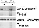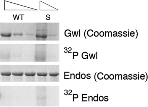 FIGURE 5:. Constitutive activity of Scant. Recombinant Drosophila Gwl proteins, either WT or K97M/Scant (equivalent to K71M Xenopus Gwl), were purified from non-OA–treated Sf9 cells and assayed for activity against a fragment of endosulfine fused to maltose-binding protein as described in Materials and Methods. The first and third rows show Coomassie staining of Gwl and endosulfine proteins used in the assay. The amount of Gwl proteins assayed varied from 1 to 50 ng. The autoradiographs in the second and fourth rows show, respectively, autophosphorylation of Gwl and phosphorylation of the endosulfine fragment fused to maltose-binding protein.