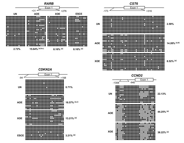 Figure 2. DNA methylation analysis of tumour suppressor genes by bisulfite sequencing. Bisulfite sequencing of RARB, CST6, CCND2 (MCF-7 cells), and CDKN2A (HCC1954 cells) gene promoters after 6 hours reprogramming. Schematics indicate the position of analysed CpG islands in promoter regions. A minimum of 10 clones were analysed for each gene and average loss of methylation was calculated for each reprogramming treatment. Black circles indicate metylated CGs, white circles indicate unmethylated CGs. Reprogramming in AOE produced the highest levels of demethylation (P < 0.05; a = AOE, XOE, ESCE vs UN; b = AOE vs XOE; c = AOE vs ESCE).