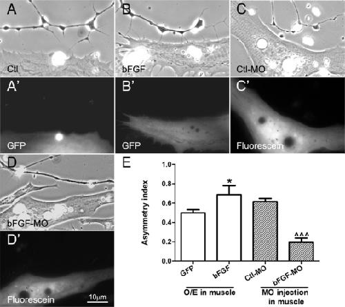 FIGURE 5:. Effects of manipulating muscle bFGF expression on axonal filopodial asymmetry. Spinal neurons were cocultured with muscle cells isolated from embryos expressing GFP (A, A′), GFP plus exogenous bFGF (B, B′), control morpholinos (C, C′), or bFGF morpholinos (D, D′). Overexpression of bFGF in muscle led to enhanced filopodial asymmetry in neurons compared with that in cocultures using control GFP-expressing muscle. On the other hand, muscle cells bearing bFGF but not control morpholinos suppressed axonal filopodial asymmetry. (E) Quantification of these results. Values shown are mean ± SEM; t test, *p < 0.05 for comparisons of neurons near GFP- and GFP/bFGF–expressing muscle cells, and ^^^p < 0.001 for comparison of neurons near Ctl-MO– and bFGF-MO–injected muscle cells.