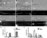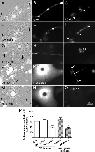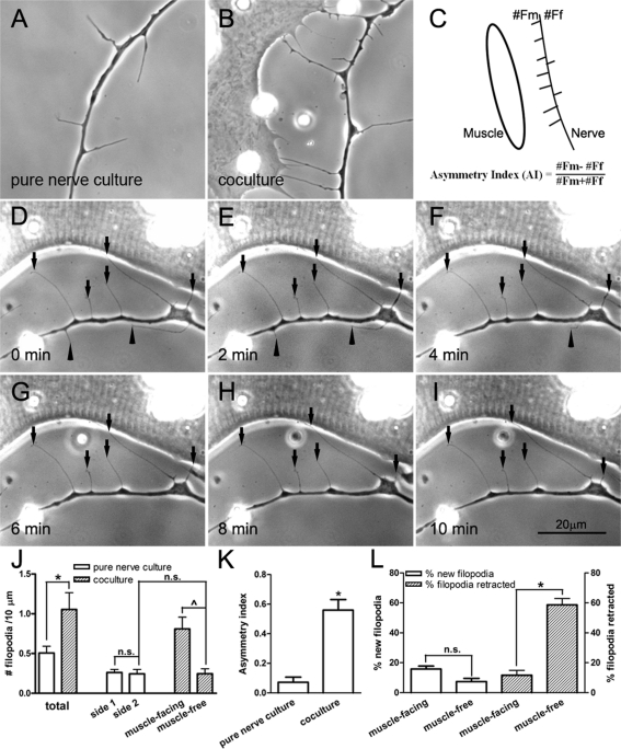FIGURE 1:. Axonal filopodia generated by Xenopus spinal neurons. In the absence of muscle target, filopodia were generated on either side of the axon with equal frequency (A). However, when a muscle cell was nearby (cell on the left in B), more filopodia were extended toward the target. (C) This difference was quantified by calculating the AI by scoring filopodia from the muscle-facing side (#Fm) vs. those on muscle-free side (#Ff) along axon segments within 30 μm from muscle. (D–I) Time-lapse recording of filopodia near a muscle cell. Muscle-facing filopodia were more stable (pointed out by arrows) than those on the opposite side (arrowheads pointing to filopodia that disappeared with time). (J) Filopodial density determined by scoring them along the length of the axon. The presence of the muscle target caused a large increase in their total density. Most of this increase was seen asymmetrically along the muscle-facing side of the axon. No asymmetry was seen along axons in pure nerve cultures without muscle target. Fifty-three axons from pure nerve culture and 42 axons from nerve–muscle cocultures were counted. (K) AI calculated from axonal segments in pure nerve cultures and nerve–muscle cocultures (22 axons from pure nerve cultures and 26 from nerve–muscle cocultures). The presence of muscle caused highly asymmetric filopodia disposition, with an AI value of 0.56 ± 0.07. (L) The formation (open bars) and retraction (hatched bars) of axonal filopodia in cocultures. On the muscle-facing side of the axon, more new filopodia were formed than on the muscle-free side. However, the major difference was seen in the stability of filopodia on the muscle-facing side. This is shown by the much lower rate of retraction during a 10-min period. Nineteen nerve–muscle cocultures were scored. In J–L, the mean ± SEM in each case is plotted, *p < 0.05 (Student's t test).
