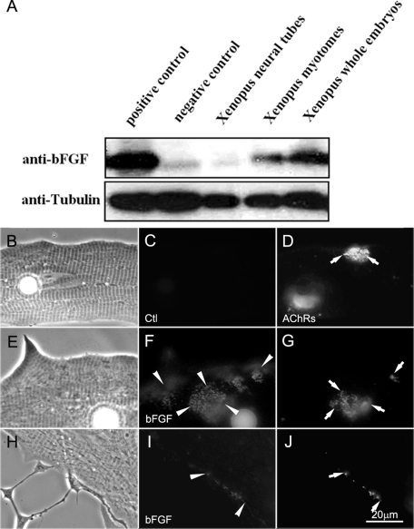 FIGURE 2:. The expression of bFGF in Xenopus embryos. (A) Western blots of Xenopus embryonic extracts were probed for bFGF. The positive and negative controls used (first two lanes) were extracts of HEK293 cells overexpressing bFGF and GFP, respectively. The other three lanes contained extracts from Xenopus neural tubes, myotomal muscle, and whole embryos. Tubulin was used as protein loading control. Xenopus myotomal muscle expressed a higher level of bFGF than neural tubes. (B–J) Localization of bFGF in Xenopus myotomal muscle cells in culture. Cells were labeled live with anti-bFGF (F, I) or anti-GFP (control, C) and FITC-conjugated secondary antibodies. R-BTX labeling (D, G, J) was used to visualize AChR clusters. Although the muscle cell showed an overall labeling for bFGF, this growth factor was more concentrated at AChR clusters in muscle (E–G) and at developing NMJs in nerve–muscle cocultures (H–J).