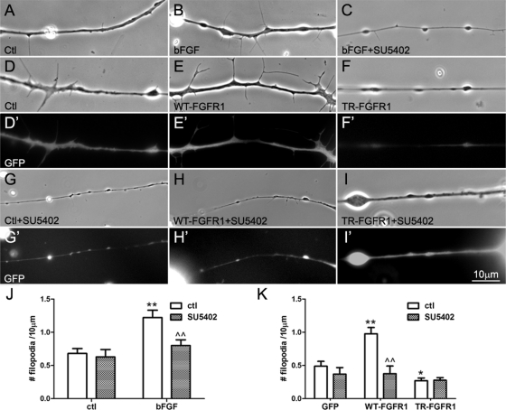 FIGURE 3:. The effect of bFGF/FGFR1 on axonal filopodial density. Spinal neurons were incubated in control medium (A) or in medium containing bFGF (100 ng/ml) (B) or bFGF plus the FGFR1 inhibitor SU5402 (20 μM) (C). Neurite segments were randomly selected, and all the filopodia present in them were counted to calculate filopodial density (number of filopodia/10 μm). More filopodia were found in neurons treated with bFGF than in control neurons, but this change was absent when SU5402 was added with bFGF; by itself SU5402 did not affect the basal filopodial assembly in neurons (J). (D, Dâ² to I, Iâ²). To test FGFR1'1 role in the induction of neuronal filopodia, spinal neurons were cultured from Xenopus embryos injected with mRNAs encoding GFP (D, Dâ² and G, Gâ²), WT-FGFR1 and GFP (E, Eâ² and H, Hâ²), or TR-FGFR1 and GFP (F, Fâ² and I, Iâ²). Neurons were examined in phase contrast for filopodia, and GFP fluorescence confirmed the expression of exogenous proteins in neurons. In WT-FGFR1 neurons more filopodia were found than in control GFP neurons (E vs. D), but in TR-FGFR1 neurons fewer filopodia were detected than in GFP neurons (F vs. D). The enhancement of filopodial growth in WT-FGFR1 neurons was blocked by the addition of SU5402 (H), but SU5402 did not significantly affect the already low filopodial density in TR-FGFR1 neurons (I) and only slightly reduced filopodia in GFP neurons (G). Filopodial densities in neurons expressing the exogenous proteins are shown in K (mean ± SEM; t test, *p < 0.05 and **p < 0.01, compared with control; ^^p < 0.01, compared with no SU5402 treatment).