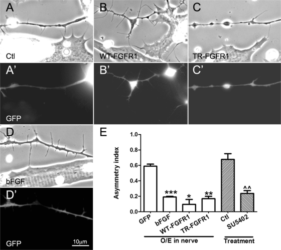 FIGURE 4:. Regulation of axonal filopodial asymmetry by neuronal FGFR1 signaling. Xenopus spinal neurons expressing GFP (A, A′) or GFP and exogenous WT-FGFR1 (B, B′), TR-FGFR1 (C, C′), or bFGF (D, D′) were cocultured with normal muscle cells, and filopodia were examined in axons near muscle cells. Nerve–muscle cocultures treated with SU5402 (20 μM) were also compared with control cocultures (E). Relative to control GFP-expressing neurons (A, A′), neurons overexpressing WT-FGFR1 (B, B′) developed more filopodia, and those expressing TR-FGFR1 grew fewer filopodia (C, C′), but in these cases the preferential extension of filopodia toward muscle was less pronounced than it was in bFGF-overexpressing neuron–muscle cocultures (D, D′). (E) Quantification of these results. Axonal filopodial AI values in cocultures involving neurons expressing exogenous bFGF and two kinds of FGFR1 constructs, as well as SU5402 treatment, are shown. Numbers are mean ± SEM; t test, *p < 0.05, **p < 0.01, and ***p < 0.001 for comparisons of bFGF/FGFR1–expressing and control GFP neurons, and ^^p < 0.01 for comparison of untreated and SU5402 treated cocultures.
