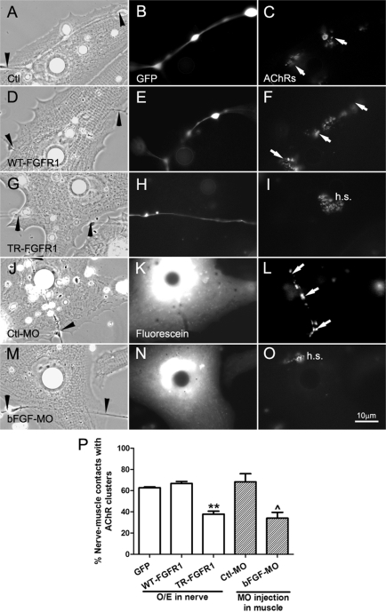 FIGURE 6:. Regulation of NMJ assembly by FGF signaling. NMJ formation in cocultures with alterations in FGF signaling was assessed by AChR clustering, which was monitored by R-BTX labeling (right). (A–C) AChR clusters (C, arrows) were present along the nerve–muscle contact in the control nerve–muscle coculture. (D–F) Similar to the control, AChR clusters were detected at nerve–muscle contacts in cocultures involving WT-FGFR1–expressing spinal neurons (D–F). (G–I) Suppression of FGFR1 function in neurons through expression of TR-FGFR1–inhibited NMJ formation, as shown by the lack of AChR clusters associated with the nerve–muscle contact. In the absence of nerve-induced AChR clustering, preexistent AChR clusters in the cells (hotspots) persisted (I, h.s.). In these parts of the figure, GFP coexpressed in the neurons was used to mark the expression of exogenous proteins. (J–L) Expressing control morpholinos in muscle (shown by fluorescence in K) did not affect NMJ formation, but the expression of bFGF morpholino (M–O) suppressed NMJ assembly, seen here once again as a lack of AChR clustering at nerve–muscle contacts and the persistence of hotspots. (P) Quantification of data showing the mean ± SEM; t test, **p < 0.01 for comparisons of FGFR1-expressing and control GFP neurons and ^p < 0.05 for comparison of Ctl-MO– and bFGF-MO–injected muscle cells.