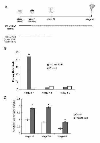 Figure 2. HDACs exert stage specific effect on left-right patterning. (A) Schematic showing the experimental procedure for NaB treatments. Embryos were exposed to 100 mM NaB from stage 1 to 7 (solid black line) and the drug was washed out (dashed black line). Embryos were collected at stage 7 for anti-acetyl H4 western blotting or were allowed to develop in 0.1X MMR until stage 45 to score organ placement or until stage 21 for ChIP experiments. (B) 100 mM NaB treatment exerts stage specific effects on left-right development. Embryos that were exposed to NaB between stage 1-7 presented significant levels of heterotaxia (100 mM NaB: 22.5%, p < 0.001). NaB exposure after stage 7 does not affect left-right development (stage 7-8 and stage 8-9). (C) NaB treatment led to a significant increase in the H4 acetylation levels. Embryos exposed to NaB from stage 1 to 7 presented 1.8 fold increase, stage 7-8 presented 2.3 fold increase and stage 8-9 presented 2.3 fold increase on the levels of acetylated histone H4 when compared to controls. (* p < 0.05).