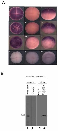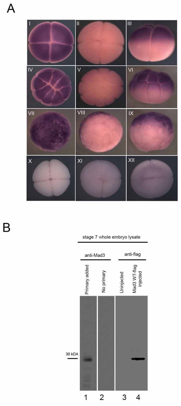 Figure 4. Xenopus Mad3 mRNA and protein are present in early embryos. (A) Mad3 mRNA is expressed by animal cells in a symmetric pattern at the stage 3 (4 cells) (I,II,III), at the stage 5 (16 cells) (IV,V,VI) and at the stage 7 (64 cells) (VII,VIII,IX). Figure X: in situ reaction control, animal view (no secondary antibody added to the reaction); XI and XII: no probe added to the reaction, animal and vegetal view, respectively. (B) Immunoblotting using stage 7 (64 cells) whole embryo lysate with an anti-Mad3 antibody. Lane 1: Whole lysate from stage 7 embryos. Anti-Mad3 recognizes a band running at 30 kDa. Lane 2: Immunoblotting control with no primary antibody added to the membrane. Lanes 3 and 4: Whole protein lysate from non injected (lane 3) or Mad3WT-flag injected embryos (lane 4) were used to detect exogenous Mad3.