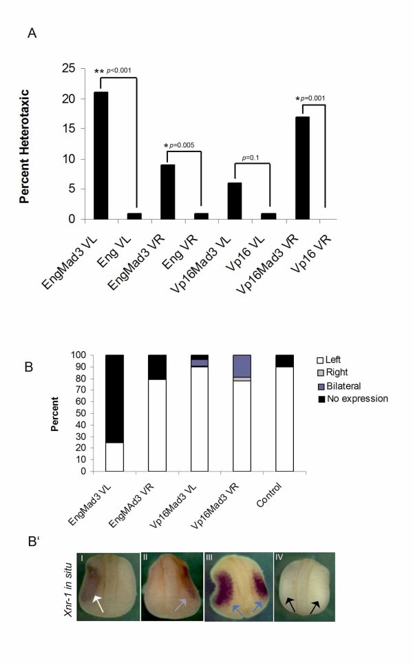 Figure 5. Mad3 is a new left-right determinant. (A) Single ventral left or ventral right blastomeres were injected with EngMad3 or Vp16Mad3 constructs and organ placement was scored at stage 45. Significant levels of heterotaxia were observed when embryos were injected with EngMad3 (left: 21%, n = 96, p < 0.001; right: 12%, n = 91, p = 0.005; control: Eng) or with Vp16Mad3 on the right side (17% n = 90, p < 0.001; 6% n = 127, p = 0.1, control: Vp16). (B) Embryos injected with EngMad3 or Vp16Mad3 were processed for in situ hybridization at stage 21 with a XNr-1 probe. XNr-1 misexpression was correlated with Vp16Mad3 injection (right injected embryos: 19% bilateral expression, n = 117; left injected: 5% bilateral expression, n = 105) and EngMad3 (left injected: 75% no expression, n = 74; right injected: 21% no expression, n = 93) if compared to control embryos (uninjected, 10% no expression, n = 103). (B') XNr-1 expression pattern characterized in EngMad3 or Vp16Mad3 injected embryos. I- Left expression indicated by the white arrow; II-right expression indicated by the gray arrow; III- Bilateral XNr-1 expression indicated by the two blue arrows; IV- Absence of XNr-1 expression as indicated by the two black arrows.