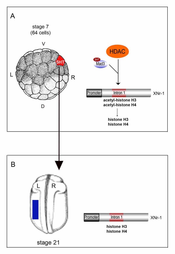 Figure 7. HDAC activity is required during LR development. (A) In this study, we found that early HDAC activity between stages 1-7 is important to proper set the pattern of expression of XNr-1 at stage 21. In addition, we also show that HDAC activity and Mad3 are important on the right side of the embryo to set XNr-1's expression and that Mad's biological activity is dependent on 5HT. Despite HDAC and Mad3 mRNAs present a symmetric pattern of expression, one theory is that because 5HT is asymmetrically distributed in the right blastomeres at stage 7 (red), 5HT binding on Mad3 (blue) may recruit HDAC activity (orange) to the intronic region of XNr-1 on the right of the embryo. HDAC activity, at early developmental stages, may be important to decrease the levels of acetylation of histone H3 and H4 on the intronic region of Nr1. (B) At stage 21, low levels of acetylation on histones (H3 and H4), set by early HDAC activity, would contribute to repress the expression of Nr1, that will be expressed only on the left side of the embryo (blue box). V-ventral; D-dorsal; R-right; L-left.