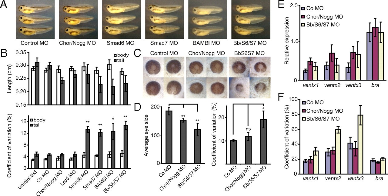 Fig. 4. Bambi and smad6/7 negative feedback canalize development. (A) Phenotypes of stage-36/7 X. laevis embryos injected with the indicated MOs. (B) (Upper) Representative body and tail length of stage-36/7 X. laevis embryos injected with MOs as in A. (Lower) Average coefficient of variation of body and tail length of stage 36/7 X. laevis embryos injected as indicated in A of (n = 3) biological replicates with 15â30 embryos per replicate. (C) Eye morphology of stage-36/7 tadpoles from embryos injected as indicated. (D) Quantification of the relative eye size. Graph shows average eye area (Left) and coefficient of variation (Right) of three biological replicates with 15â30 embryos per replicate. (E) qPCR expression analysis of the indicated genes from individual X. laevis embryos of stage 10.5, which were injected at the four-cell stage with the indicated MOs (n = 9â10 embryos per sample). (F) Coefficient of variation of early BMP4 marker gene expression from individual stage 10.5 X. laevis embryos as in C (n = 2). Error bars, SD; *P < 0.05 and **P < 0.01 (unpaired t test).
