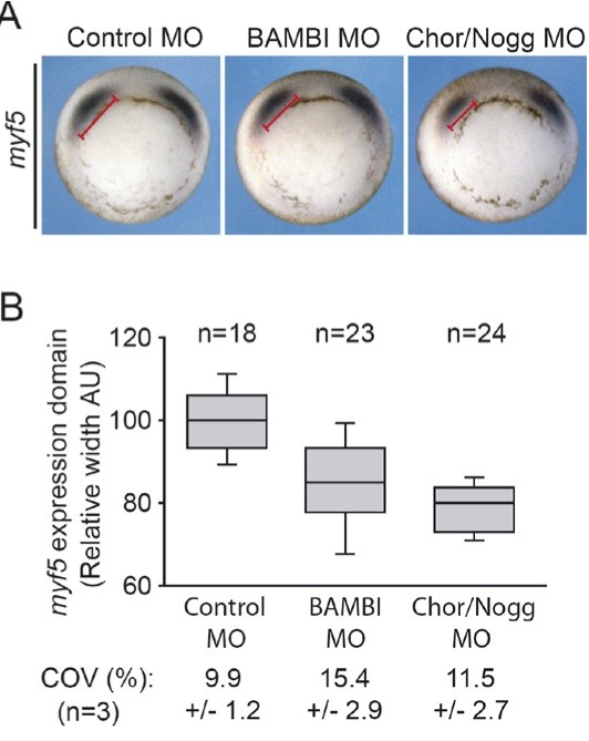 Fig. S8. Bambi knock down increases variability of the myf5 expression domain width. (A) In situ hybridization of myf5 in midgastrula X. laevis embryos injected equatorially with either 40ng control, 40ng BAMBI MO, or 20/20ng Chordin/Noggin MOs per embryo equatorially at the 2-4 cells stage. (B) Morphometric analysis of myf5 expression domain- width of embryos injected with MOs as in (A). Error bars indicate s.d.; gray boxes represent 50-percentile spread; (AU) arbitrary units; Coefficient of variation (COV).