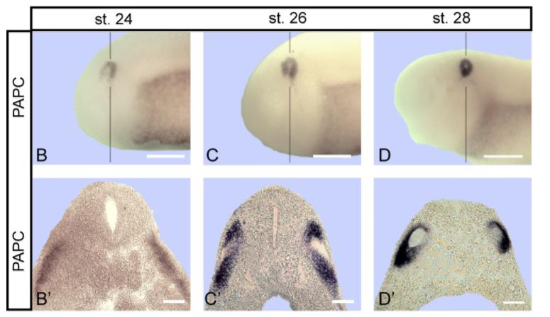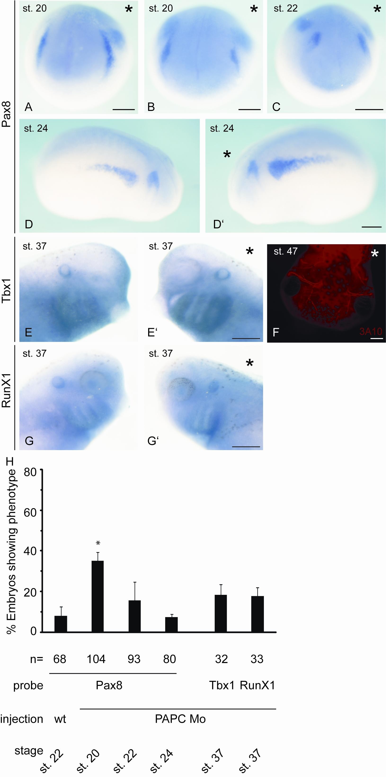 Additional file 1. Injection of PAPC Morpholinos has no effect on early induction of the otic placode and on neural differentiation. (A, B, C, D, D') In situ hybridization for Pax8, a marker of the otic placode. At stage 20 the majority of embryos showed no phenotype (A) while some showed a reduction in Pax8 expression at the PAPC Mo injected side (B). At stage 22 (C) or 24 (D, D') no significant alterations were observed upon PAPC depletion. (E, E', G, G') Expression of neural markers like Tbx 1 (E, E'), RunX1 (G, G') was not significantly affected by PAPC Mo injections. (F) The peripheral nervous system appeared normal when immunostained with the neurofilament antibody 3A10. (H) Statistical analysis of embryos showing a reduced marker expression by PAPC morpholino treatment. A statistical significant increase in embryos with decreased expression was only observed in stage 22 embryos probed with Pax8. Asterix marks the injected side (A-G'). Scale bar 250 μm.