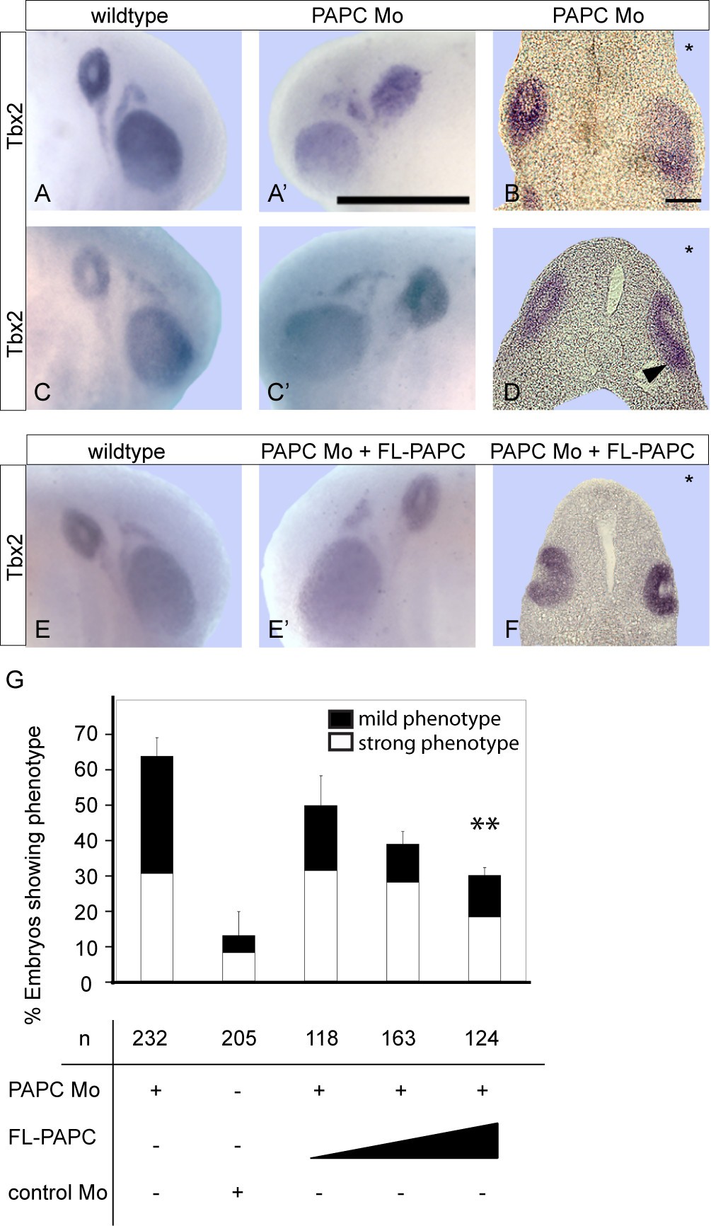 Figure 2. Knockdown of xPAPC leads to otocyst deformation. (A, A', B, C, C', D) ISH for Tbx2 shows an altered expression pattern at the injected side (A', C') compared to the wildtype side (A, C). A severe phenotype is shown in (A, A', B), a mild phenotype in (C, C', D). Corresponding transversal sections are presented in (B, D). Note the infolding epithelium at the injected side, arrowhead. (E, E', F) Rescue by coinjection of 500 pg FL-PAPC RNA, (E) wildtype, (E') PAPC Mo coinjected with full-length PAPC, (F) corresponding transversal section. (G) Statistical evaluation of xPAPC depletion and rescue experiments at stage 26. The embryos are single side injected and phenotypes were examined via Tbx2 ISH. FL-PAPC RNA was coinjected in increasing amounts (100 pg, 250 pg, 500 pg), also a control Morpholino was injected to eliminate the possibility of unspecific effects. The data are normalized relating to uninjected wildtype embryos. FL, full-length; Mo, antisense morpholino; n, number of embryos. Injected side is indicated by asterisks in transversal sections. Scale bar (A') 500 μm, (B) 100 μm. ** = p < 0,01.