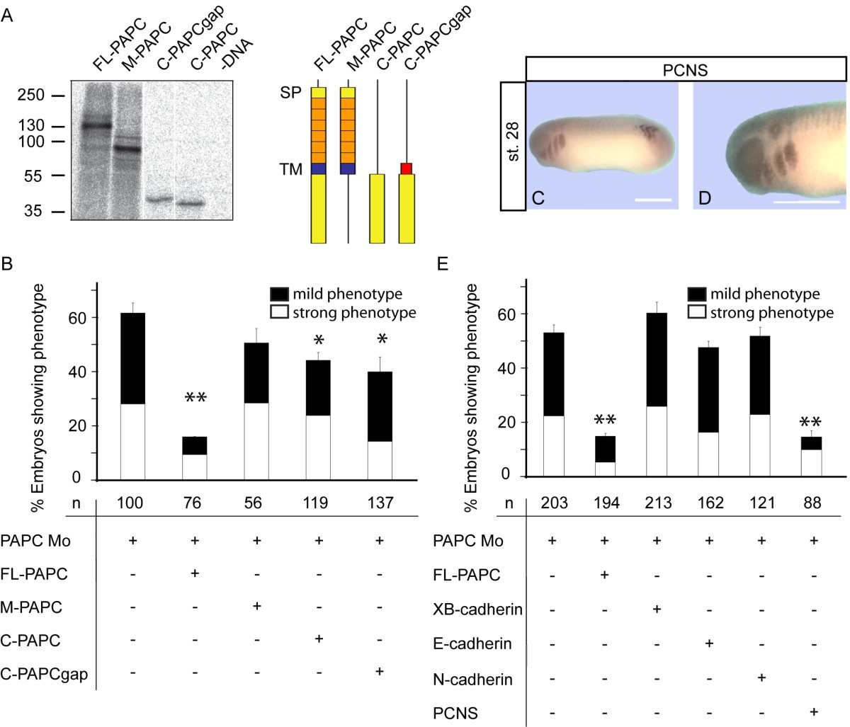 Figure 5. Functional analysis of xPAPC during otic development. (A, B) Coinjection of different functional xPAPC domains with xPAPC Mo. (A) Constructs that were coinjected in (B), comprise of six characteristic extracellular cadherin domains (orange), transmembrane domain (blue), gap43 membrane anchor (red) or cytoplasmic part (yellow). All used constructs were tested for successful expression in a radioactive TNT assay. (B) 500 pg RNA were coinjected with xPAPC Mo into one blastomere of 2-cell stage. At stage 26 the embryos were examined via ISH for Tbx2. The data are normalized relating to uninjected wildtype embryos. Only coinjection of FL-PAPC showed reconstitution, C-PAPC and C-PAPCgap partially rescued. (C, D) ISH for PCNS at tailbud stage (stage 28). (D) Enlarged head shows a strong signal in the otic region, as well as in branchial arches. (E) Reconstitution analysis of xPAPC Mo through coinjection of classical cadherins or PCNS. 500 pg of RNA were coinjected with xPAPC Mo into one blastomere of 2-cell stage. At stage 26 the embryos were examined via Tbx2 ISH. The data are normalized relating to uninjected wildtype embryos. xPAPC function in inner ear development could be replaced by the protocadherin PCNS but not by classical cadherins. C, cytoplasmic; FL, full-length; M, membrane; Mo, antisense morpholino; n, number of embryos; SP, signal peptide; TM, transmembrane domain. Scale bar 500 μm. * = p < 0,05; ** = p < 0,01