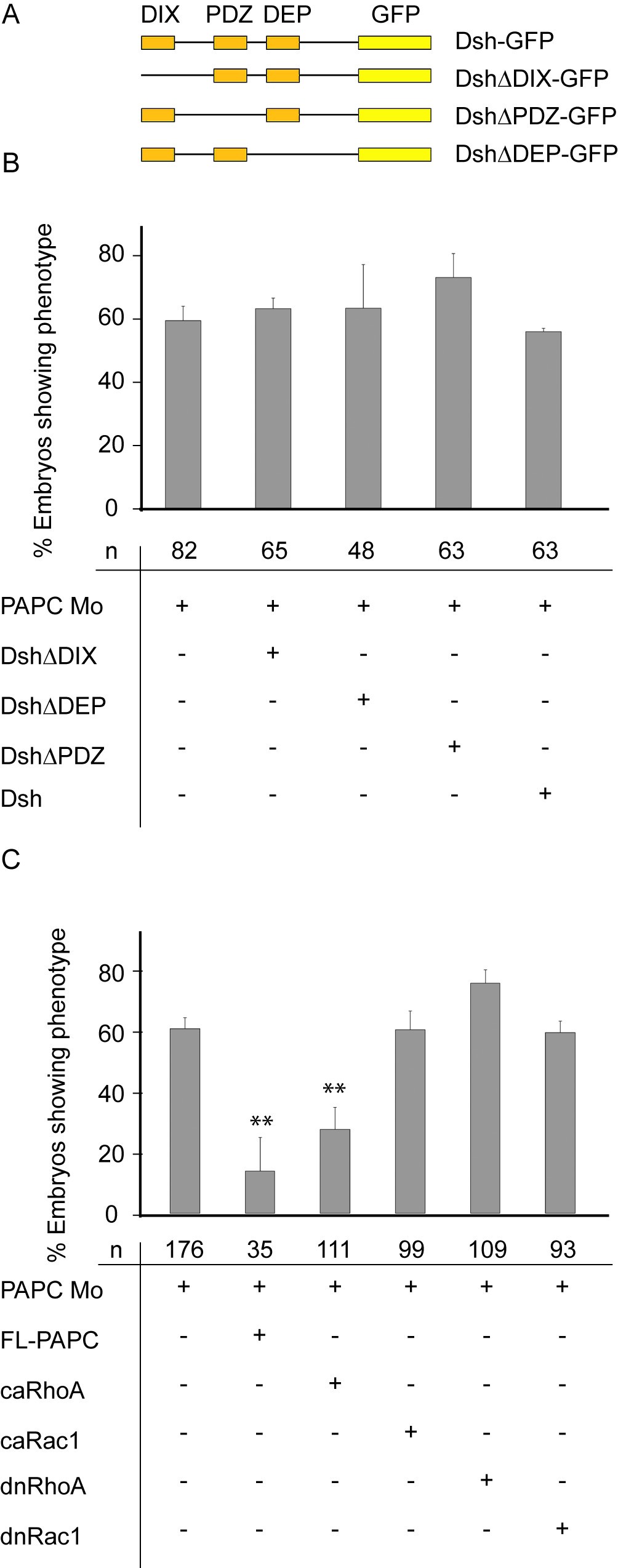 Figure 6. xPAPC depletion is rescued by ca RhoA but not by disheveled. (A, B) Coinjection of different disheveled constructs, shown in (A). (B) 500 pg RNA were single side coinjected with xPAPC Mo at 16-cell stage in every one of the two adjacent ventral and dorsal cells in the animal part. At stage 26 the embryos were examined via Tbx2 ISH. The data are normalized relating to uninjected wildtype embryos. None of the constructs showed a reconstitution, so neither the Dsh-coupled PCP, nor canonical Wnt signaling pathway is involved in PAPC function. (C) Small GTPases Rac1 and RhoA were coinjected with xPAPC Mo as dominant negative (dn) or constitutive active (ca) constructs. The injection was carried out as described in (B). To further reduce secondary effects the injection was carried out with DNA. Reconstitution can be achieved by coinjection of 5 pg ca RhoA. Ca, constitutive active; Dn, dominant negative; Dsh, disheveled; FL, full length; Mo, antisense morpholino; n, number of embryos. ** = p < 0,01.