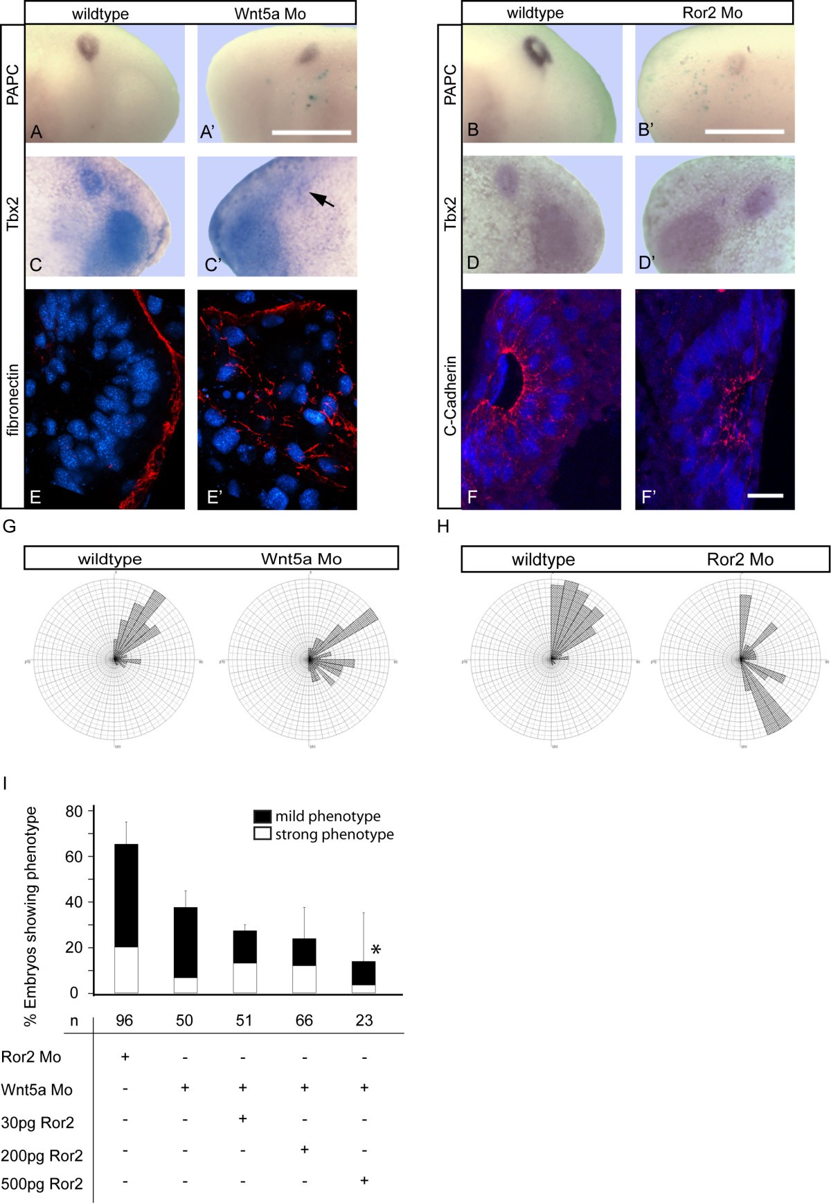 Figure 7. Knockdown of Wnt5a or Ror2 phenocopies xPAPC depletion. Knockdown of Wnt5a (A, A', C, C', E, E') or Ror2 (B, B', D, D', F, F'), respectively, via antisense morpholino injection at 16-cell stage in each of the two adjacent ventral and dorsal cells in the animal pole. (A, A', B, B', C, C', D, D') ISH at stage 28 for (A, A', B, B') xPAPC or (C, C', D, D') Tbx2. Either Wnt5a or Ror2 depletion showed a reduction in xPAPC expression (A', B') as well as deformations of the otocyst at the injected side (A', B', C', D'). (E, E', F, F') Immunostaining of Wnt5a (E, E') or Ror2 (F, F') depleted otic epithelia. Mo was injected as described in (A) and ISH for Tbx2 was performed at stage 26. Embryos were then sliced and immunostained for different epithelial markers like (E, E') fibronectin or (F, F') C-Cadherin in red. The nuclei were stained in blue for DAPI. As in xPAPC depleted embryos the injected otocysts showed epithelial disorganization indicated through inaccurate nuclei alignment and displaced adhesion proteins (E', F'). (G, H) Angle measurements of DAPI stained nuclei in immunostained sections reveal a disorganization of the epithelial structure of the otocyst. While in uninjected otocysts DAPI cells are orientated in angles between 0 and 50ostly, the cells on the injected sides (G: Wnt5a Mo; H: Ror2 Mo) shows angles between 0 and 170 (I) Knockdown of Wnt5a is rescued by Ror2 RNA coinjection in a dose-dependent manner. Injections were carried out at 16-cell stage as described in (A). The embryos were examined at stage 26. Mo, antisense morpholino; n, number of embryos. Scale bar (A', B') 500 μm, (E', F') 20 μm. Arrow points to the deformed otocyst. * = p < 0,05.