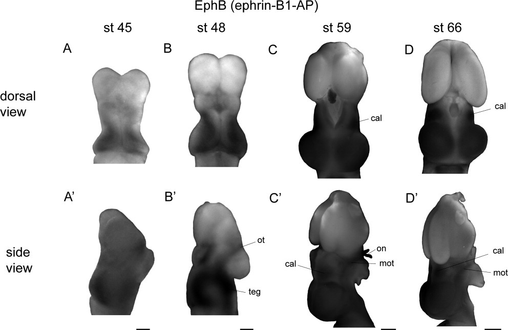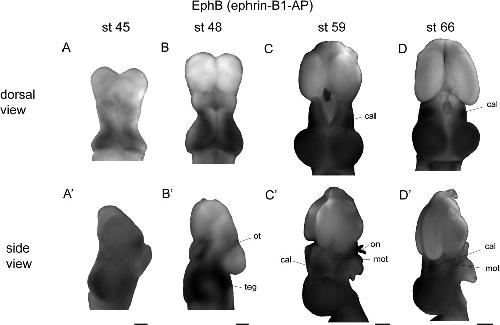 Figure 3 EphB expression. (AâD) Dorsal views of stage 45 (A), 48 (B), 59 (C), and 66 (D) brains stained for EphB expression. (Aâ²âDâ²) Side views of brains at the same age. Dorsal and side views are of the same brains, except at stage 45, where a more representative side view was chosen. At both stage 45 and 48, EphBs are expressed in a high caudomedial to low rostrolateral gradient in the tectum and at stage 48 also in the tegmentum and optic tract. (CâDâ²) At st 59 and 66, EphBs are expressed uniformly across the surface of the tectum, as well as in the central anterolateral nucleus and the outer margins of the optic tract. Scale bars: AâBâ² = 100 μm, CâDâ² = 500 μm. cal: central anterolateral nucleus; mot: marginal zone of the optic tract; on: optic nerve; ot: optic tract; teg: tegmentum. |